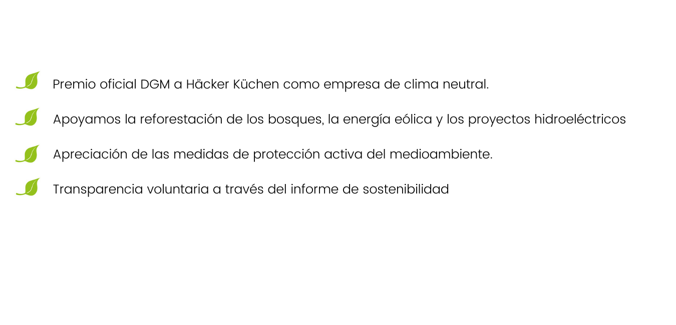 Durante la fabricación las nuestras cocinas se produce un impacto neutro para el clima: Häcker Küchen registra sus propias emisiones, las compensa con los ahorros positivos conseguidos por la empresa y el resto lo compensa adquiriendo certificados de protección del clima. Con estos certificados Häcker apoya la reforestación de los bosques, la energía eólica y proyectos de energía hidráulica.